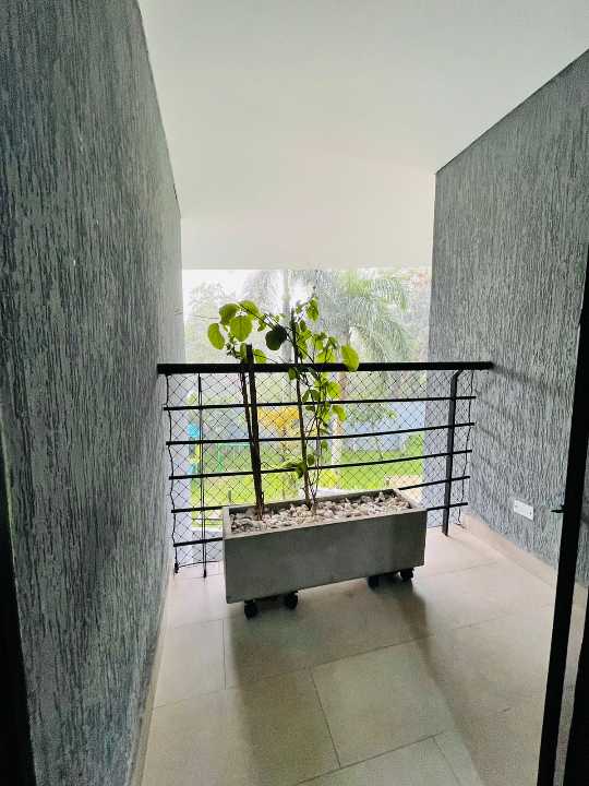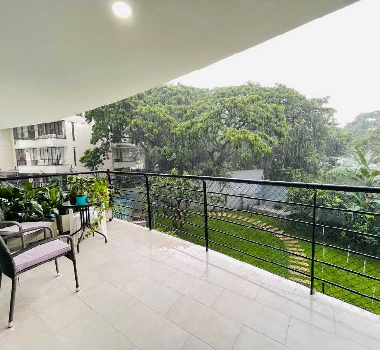 Balcón con vista a la piscina y zona verde, muy tranquilo y natural.