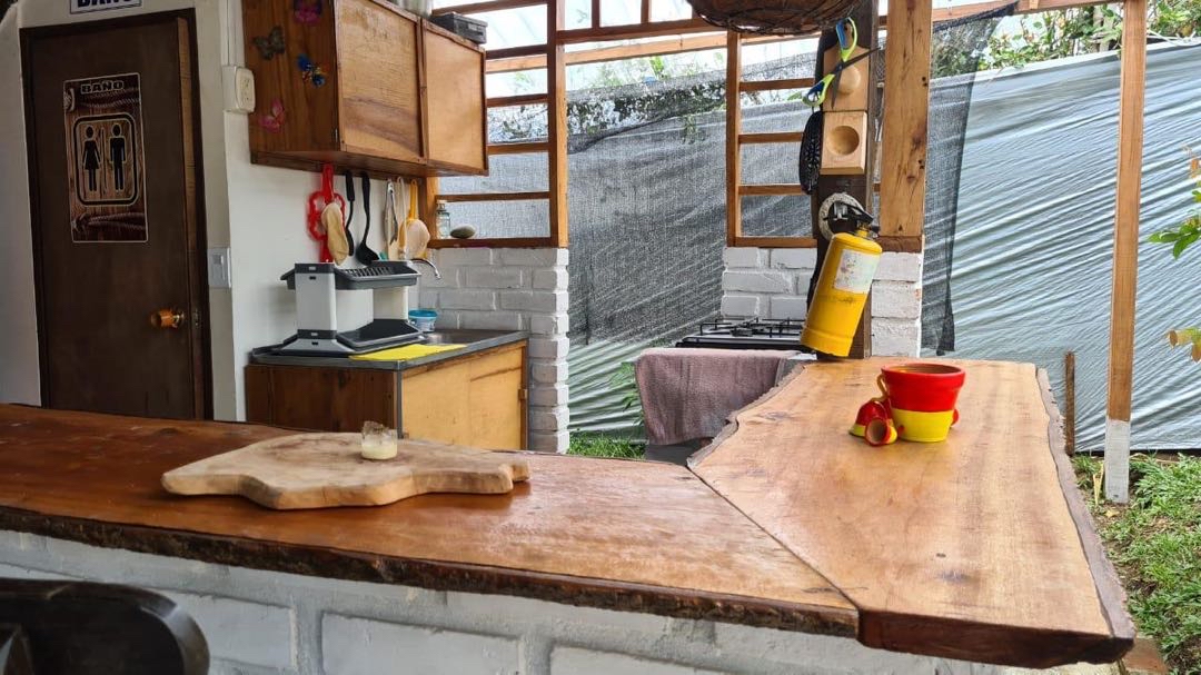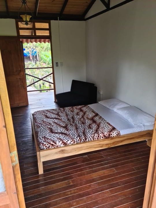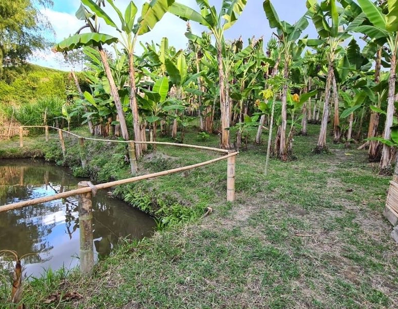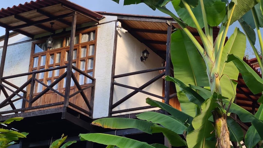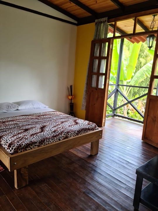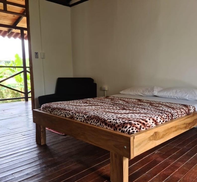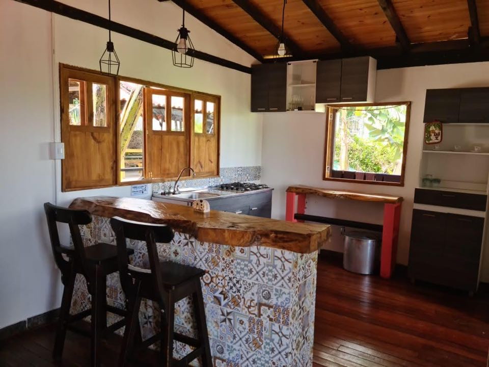 alcobas, 6 baños completos ducha y agua caliente, Cada cabaña con su cocina completa, dos quioscos fonda y BBQ, salón de juegos, cancha pequeña de futbol, lago de peces, gallinero y siembra de 50 árboles de plátano.