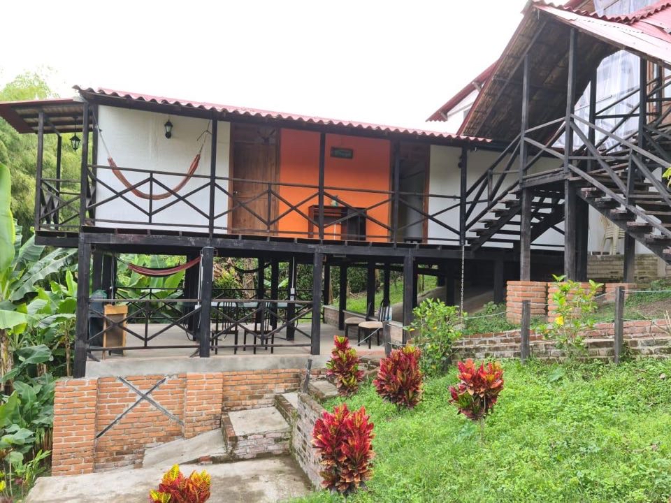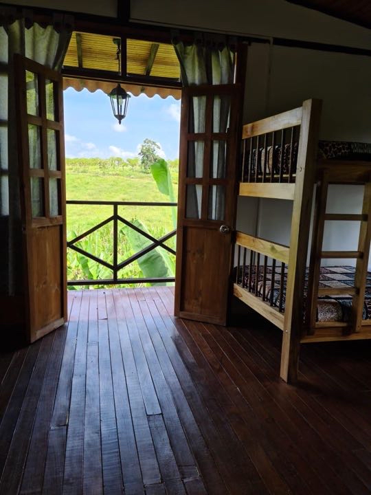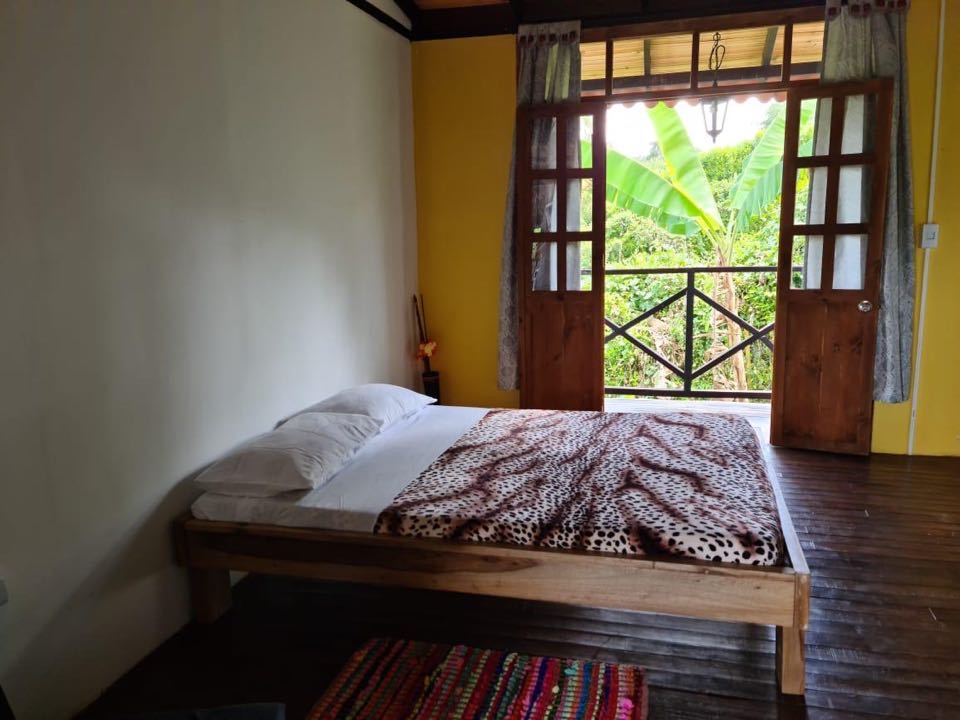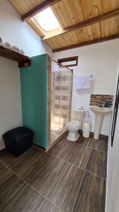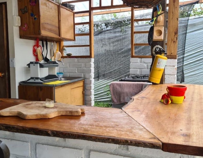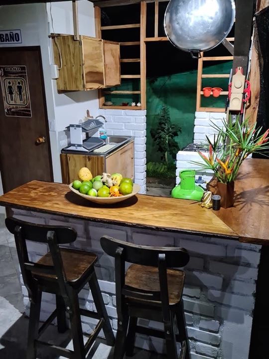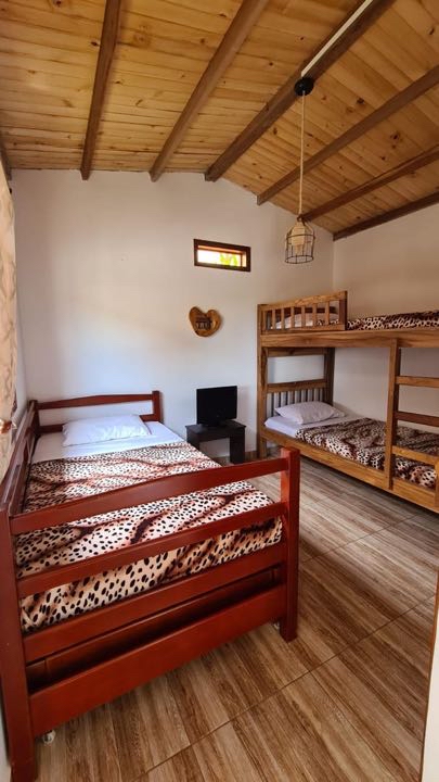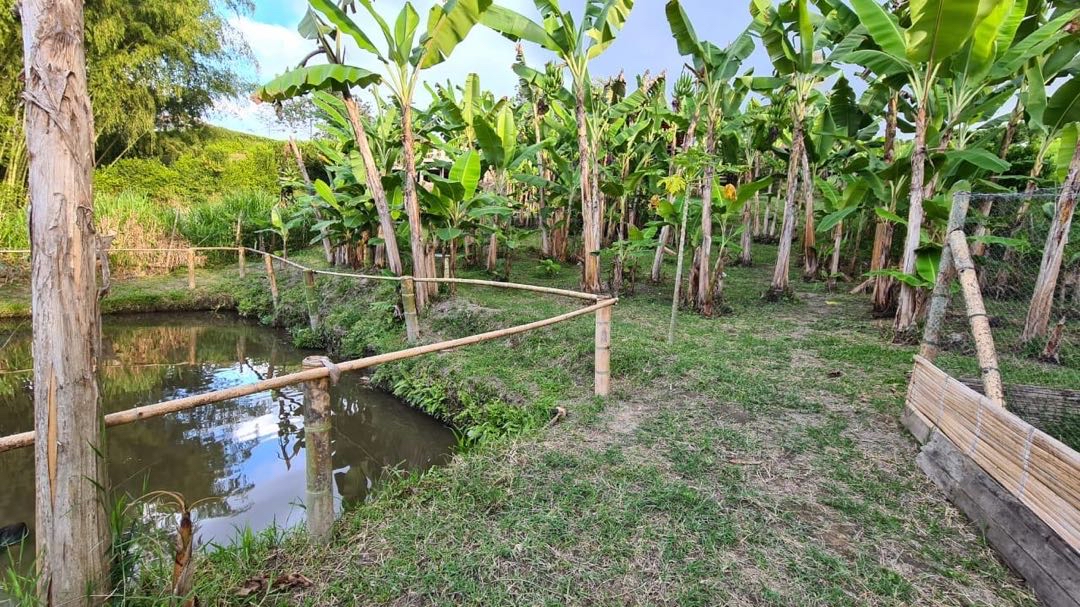 alcobas, 6 baños completos ducha y agua caliente, Cada cabaña con su cocina completa, dos quioscos fonda y BBQ, salón de juegos, cancha pequeña de futbol, lago de peces, gallinero y siembra de 50 árboles de plátano.